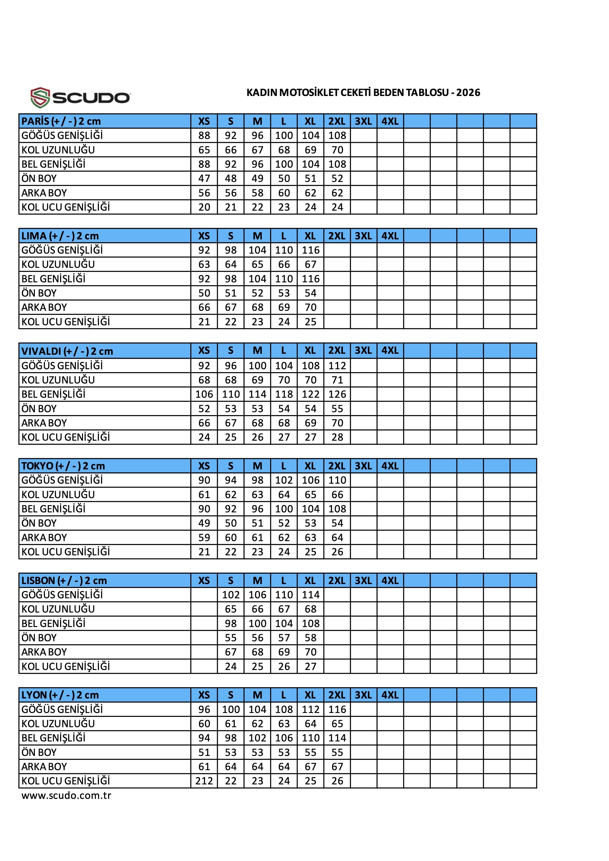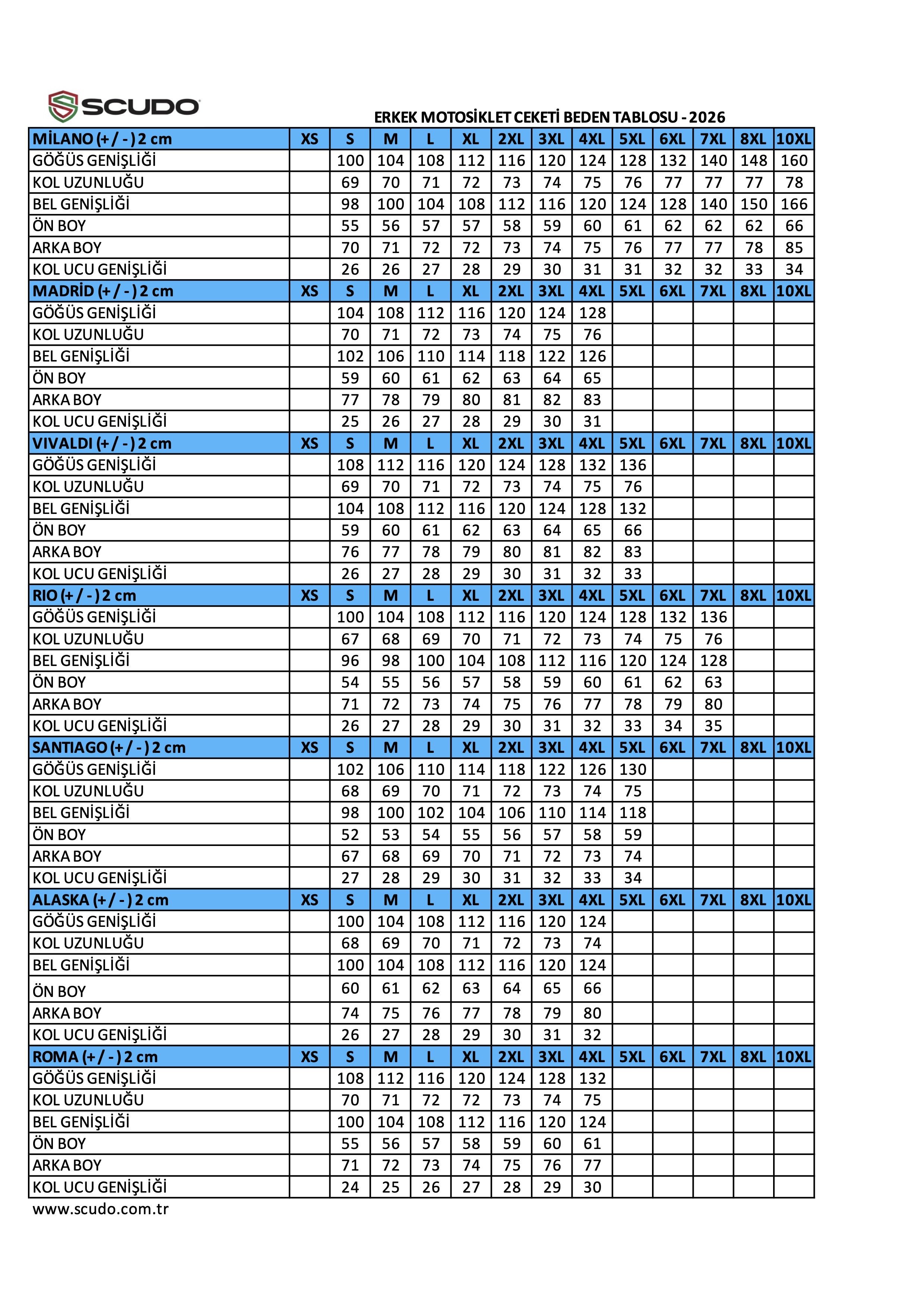 Püf Noktası: Motosikletin üzerindeymiş gibi kollarınızı ileri uzatın; kollar çok yukarı çekiliyorsa bir beden büyüğünü değerlendirin. Genel olarak ölçüler aşağıdaki gibidir fakat modellerin yapısına göre de beden değişiklik gösterebilir. Scudo modelleri için özel ölçü tablolarını incelemenizi öneririz.