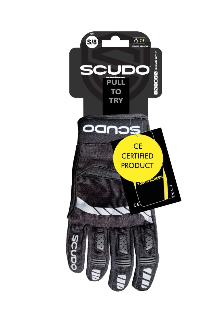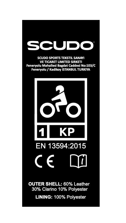 Scudo Tavsiyesi: Satın aldığınız eldivenin iç etiketinde "Motosikletçi" ikonu (motosiklet süren insan figürü) ve EN 13594 kodunun olduğundan mutlaka emin olun.